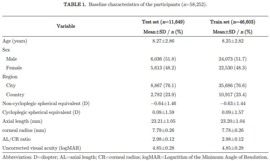 表1總結(jié)了參與者的基線特征,顯示訓(xùn)練集和測試集在年齡、性別、城鄉(xiāng)分布以及各項(xiàng)眼部測量指標(biāo)上均具有良好平衡性。訓(xùn)練集與測試集的平均年齡分別為8.25±2.82歲和8.27±2.86歲,性別分布相似(男性占比51.7% vs 51.8%),城鄉(xiāng)居住模式接近(城市居民占比76.6% vs 76.1%)。兩組在非睫狀肌麻痹等效球鏡(-0.63±1.44 D vs -0.64±1.46 D)、睫狀肌麻痹等效球鏡(均為0.09±1.57 D)、眼軸長度(23.20±1.04 mm vs 23.21±1.05 mm)、角膜曲率半徑(7.78±0.26 mm vs 7.79±0.26 mm)、眼軸長度/角膜曲率半徑比值(均為2.98±0.12)和裸眼視力(均為4.85±0.28 logMAR)上均非常接近。