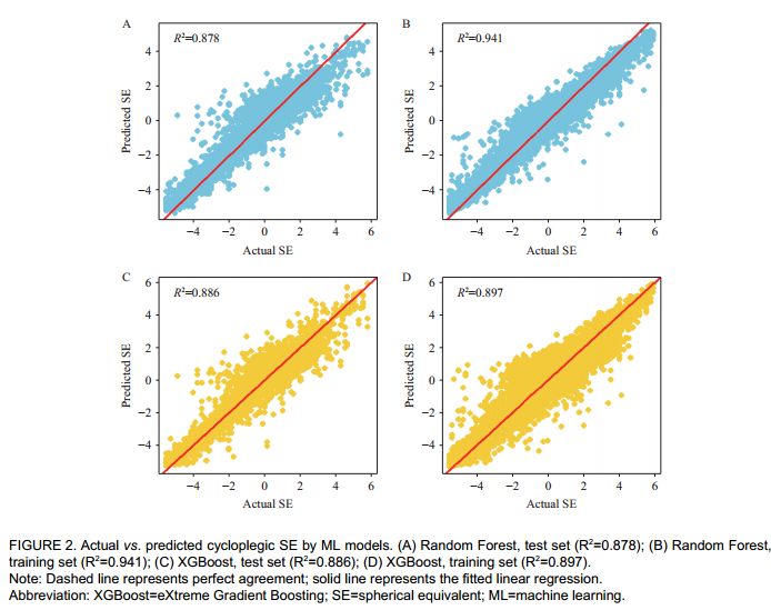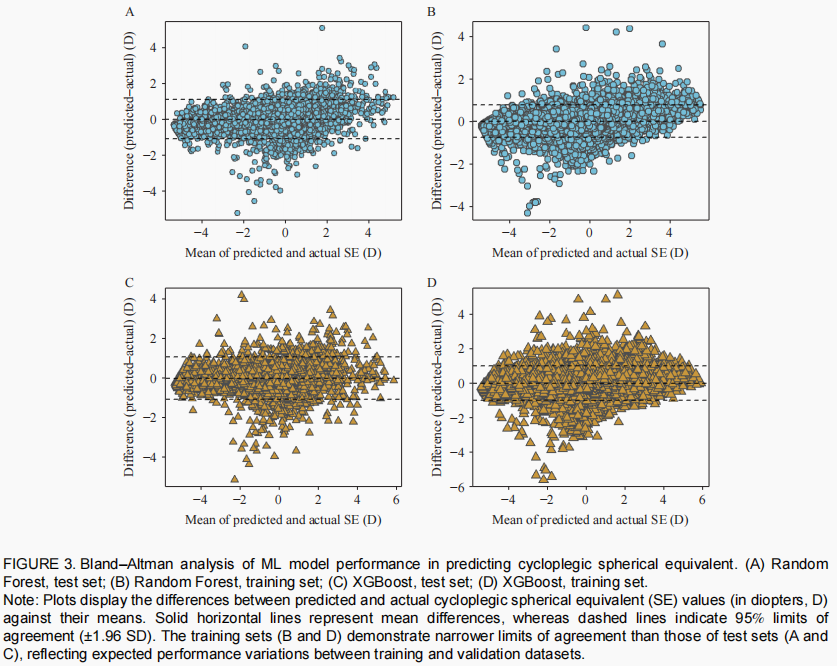 本研究成功構(gòu)建了基于隨機(jī)森林和XGBoost的ML模型,能夠利用非睫狀肌麻痹驗(yàn)光數(shù)據(jù)和眼部生物參數(shù)準(zhǔn)確預(yù)測兒童及青少年的睫狀肌麻痹等效球鏡。模型在測試集中表現(xiàn)出優(yōu)異的預(yù)測性能,明確了非睫狀肌麻痹等效球鏡、眼軸長度/角膜曲率半徑比值、眼軸長度和裸眼視力為關(guān)鍵預(yù)測因子。Bland-Altman分析證實(shí)了預(yù)測結(jié)果與真實(shí)值之間的良好一致性。該模型為在睫狀肌麻痹驗(yàn)光不可行的情況下,進(jìn)行大規(guī)模屈光不正監(jiān)測提供了準(zhǔn)確且實(shí)用的替代方案。