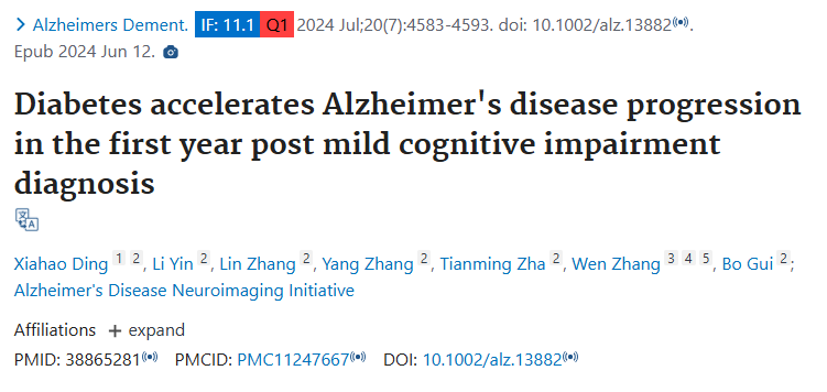 Ding X, Yin L, Zhang L, et al. Diabetes accelerates Alzheimer's disease progression in the first year post mild cognitive impairment diagnosis. Alzheimer's Dement. 2024;20:4583-4593. doi:10.1002/alz.13882