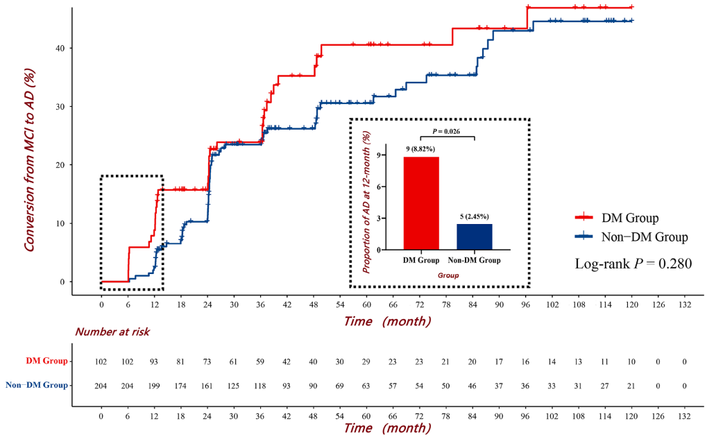 Kaplan-Meier生存曲線顯示,DM組在MCI診斷后12個月內(nèi)AD轉(zhuǎn)換率更高(8.82% vs. 2.45%, P=0.026),但整體隨訪期間無顯著差異。認知評估表明,DM組在12個月隨訪時MoCA、EcogSPOrgan和FAQ評分顯著惡化。