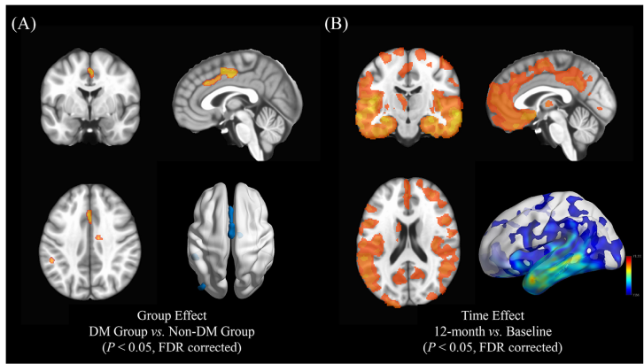 灰質(zhì)體積和皮質(zhì)參數(shù):VBM分析顯示DM組灰質(zhì)體積顯著減少(FDR校正P<0.05),腦溝深度在12個月隨訪時明顯變淺。