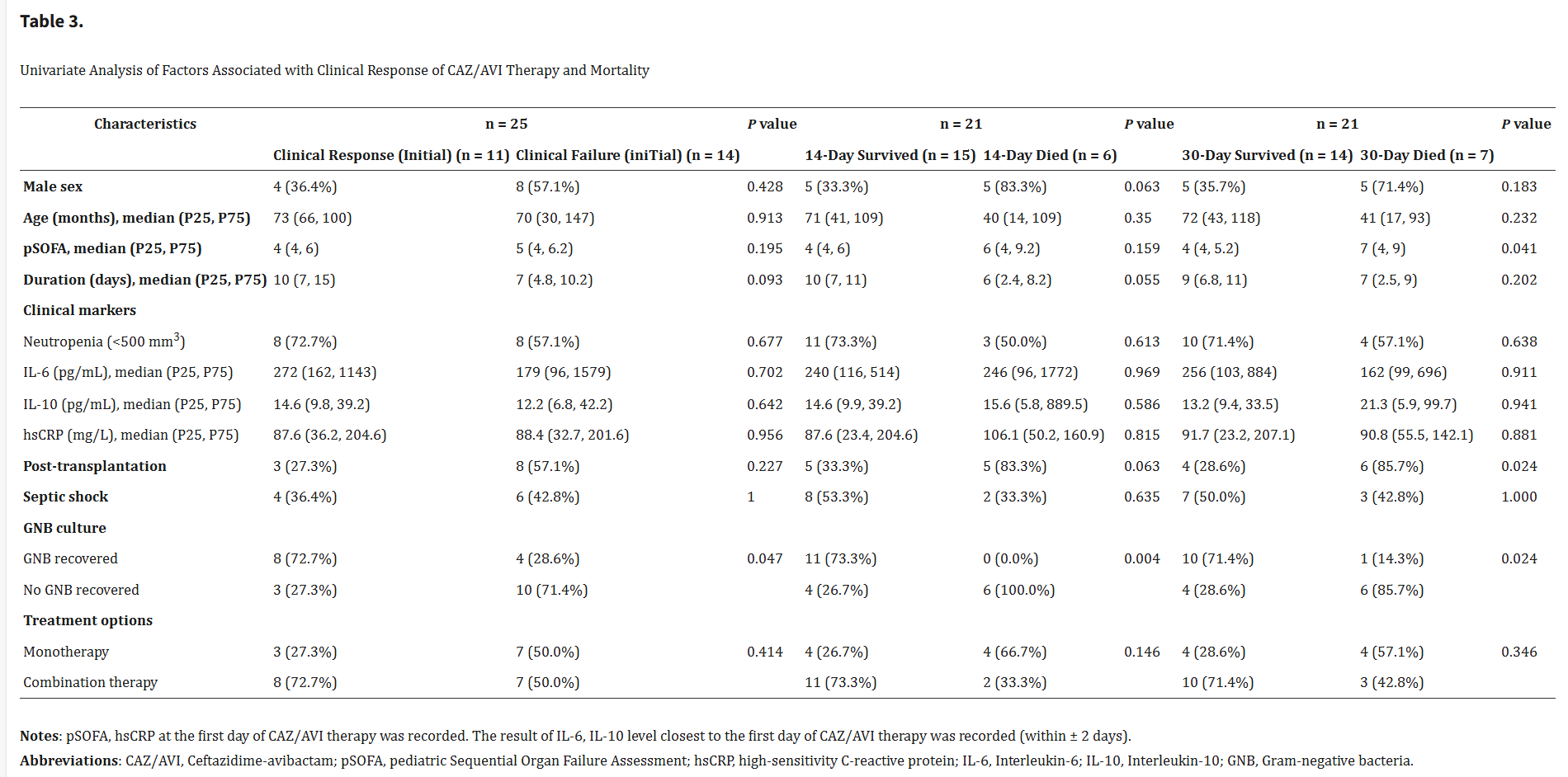 為了探索與臨床反應相關(guān)的可能因素,分析了25名患者最初25個療程的數(shù)據(jù),以避免個體第二個療程的數(shù)據(jù)不獨立(表3和4)。與未恢復GNB的組(23.1%,3/13)相比,確診 GNB 病原體的患者表現(xiàn)出更好的臨床反應,為66.7%(8/12) (P = 0.047)。在其他特征上,如年齡、性別、首日pSOFA評分、CAZ/AVI治療持續(xù)時間、中性粒細胞減少癥、臨床標志物(包括IL-6、IL-10和hsCRP)、基礎(chǔ)疾病、原發(fā)感染類型、移植、感染性休克或治療選擇(單藥治療或聯(lián)合治療))在臨床反應結(jié)果方面沒有發(fā)現(xiàn)顯著差異。