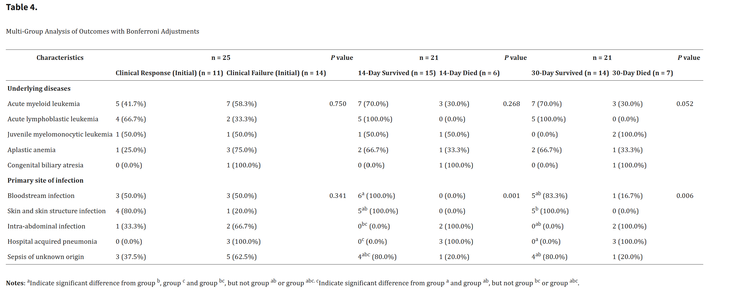 CAZ/AVI治療開始后14 d、30 d和90 d觀察時間點的全因死亡率分別為24.0%(6/25)、28.0%(7/25)和44.0%(11/25)。由于樣本量較小,本研究采用單因素分析代替多因素logistic回歸來探討與死亡率相關(guān)的因素。14天死亡率與沒有確診的GNB病原體(100% vs 0%,與GNB康復組相比,P=0.004)顯著相關(guān)(表3),以及以腹腔內(nèi)感染(IAI)和醫(yī)院獲得性肺炎(HAP)為主要感染部位(100% vs 0%,分別與血流感染(BSI)和皮膚和皮膚結(jié)構(gòu)感染(SSSI)組相比,P = 0.001)(表4)。30天死亡率與沒有確診的GNB病原體(85.7% vs 14.3%,P = 0.024)、CAZ/AVI治療第一天較高的pSOFA評分(7 vs 4,P=0.041)、移植史(85.7% vs 28.6%,P=0.024)(表3)和HAP作為主要感染部位(100% vs 0%,與SSSI組相比,P=0.001)(表4)。其他特征(如基礎(chǔ)疾病、CAZ/AVI持續(xù)時間、炎癥生物標志物、單一療法或聯(lián)合療法等治療選擇)在組間沒有顯著差異。