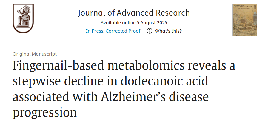 本研究將指甲代謝組學作為一種有前景的非侵入性策略,用于AD的生物標志物發(fā)現(xiàn)和疾病分期。作者發(fā)現(xiàn)十二烷酸是一種可靠且獨立的生物標志物候選物,能夠反映AD的嚴重程度。其在AD臨床進程中的下降凸顯了脂肪酸代謝在疾病進展中的作用。指甲代謝組具有較高的患者接受度,并能提供代謝的綜合時序快照,有望為AD及其他神經(jīng)退行性疾病的早期診斷、風險分層和監(jiān)測開辟新的途徑。