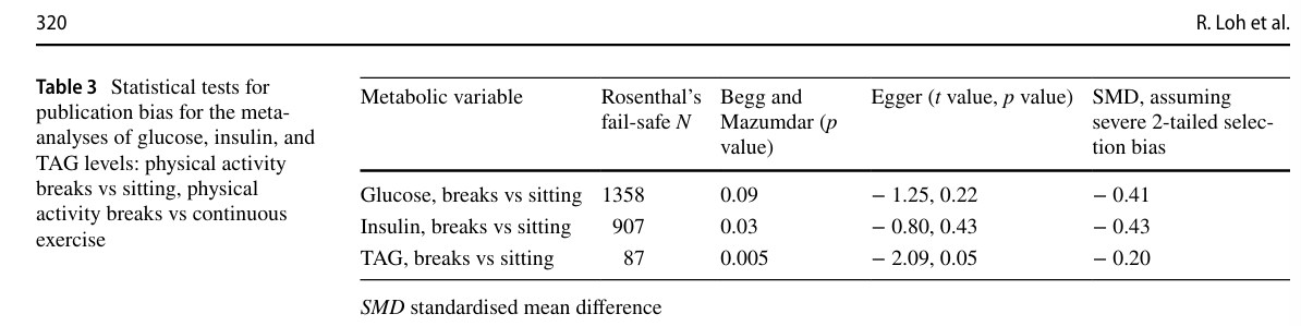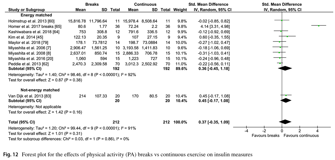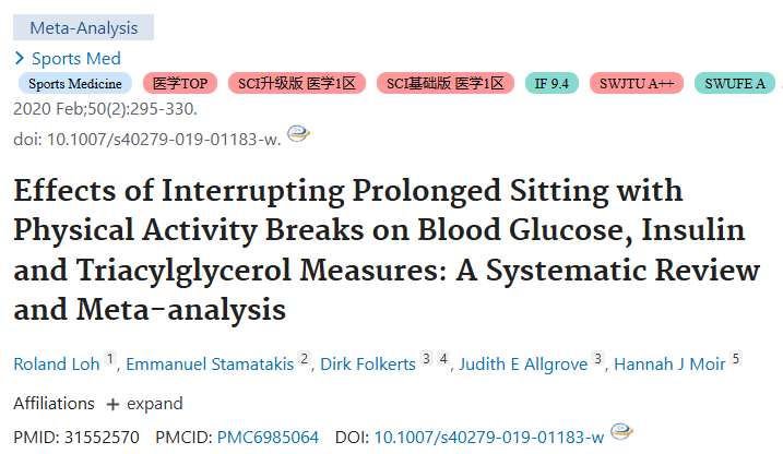 2020年2月,英國金斯頓大學RolandLoh和HannahJ.Moir團隊在《Sports Medicine》(中科院1區(qū),2023年影響因子11.7)發(fā)表了一項系統(tǒng)綜述與薈萃分析研究,結(jié)果顯示久坐時加入PA間歇可中度降低餐后血糖、胰島素水平,輕微降低甘油三酯,且BMI較高人群血糖改善更顯著;在能量消耗匹配情況下,PA間歇在降低血糖方面略優(yōu)于持續(xù)運動,但對胰島素和甘油三酯無顯著差異。