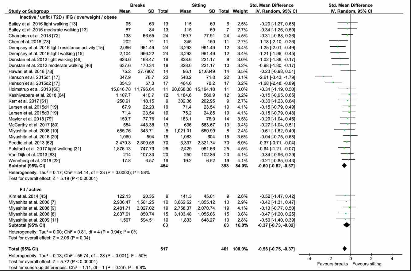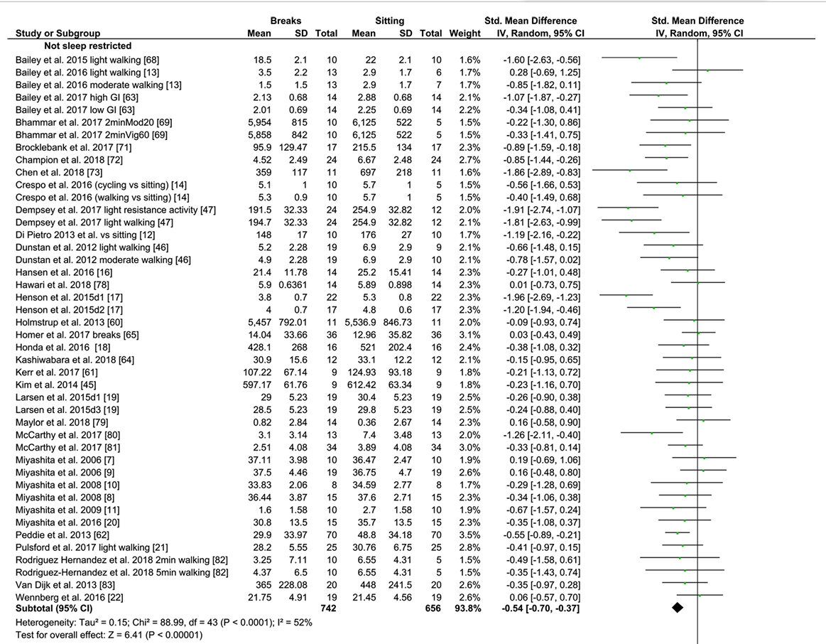 這表明久坐時加入PA間歇,可中度降低餐后血糖和胰島素水平,輕微降低甘油三酯,且所有差異均具有統(tǒng)計學意義。