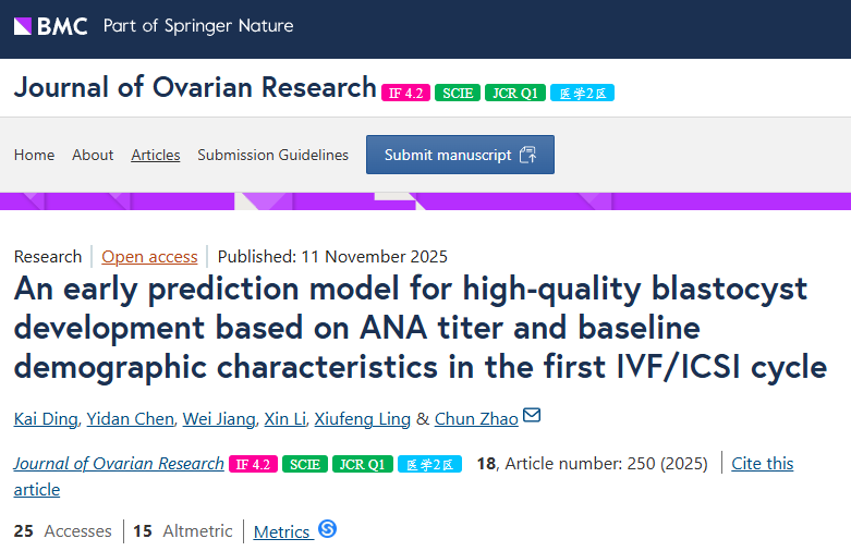 2025年11月,南京醫(yī)科大學(xué)附屬婦產(chǎn)醫(yī)院的Chun Zhao教授和Kai Ding、Yidan Chen教授團(tuán)隊在Journal of Ovarian Research發(fā)表了一項回顧性研究。結(jié)果顯示,女性年齡、AMH水平、基礎(chǔ)竇卵泡計數(shù)(AFC)、ANA滴度以及自然流產(chǎn)次數(shù)是優(yōu)化囊胚發(fā)育的獨立預(yù)測因素?;谶@五個易于獲取的基線特征構(gòu)建的預(yù)測模型具有可接受的臨床預(yù)測能力,有助于在胚胎培養(yǎng)前對不孕患者進(jìn)行個體化診療。