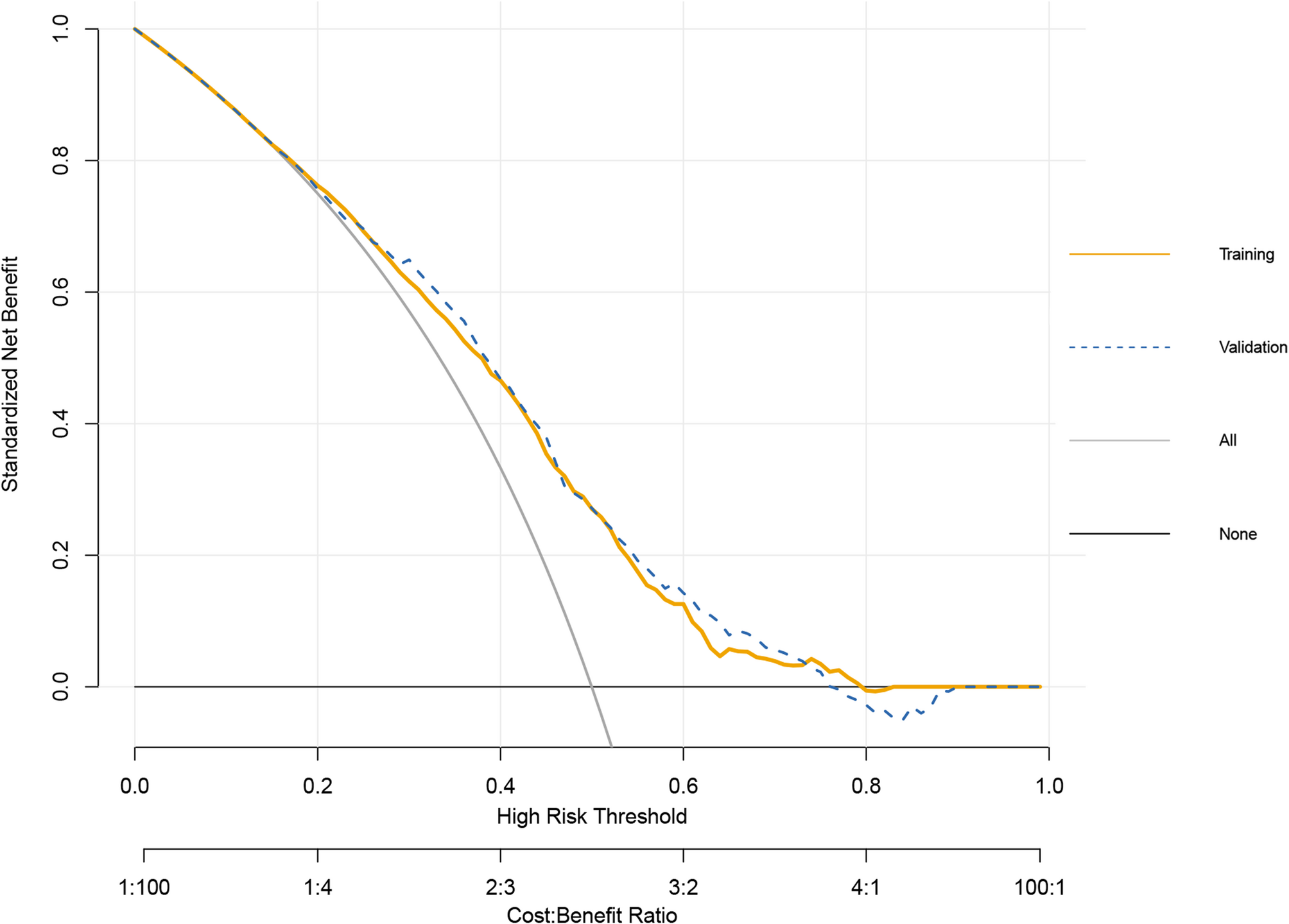 基于上述五個關(guān)鍵變量的多變量邏輯回歸模型顯示,在訓(xùn)練集中,模型的AUC為0.69(95% CI: 0.66-0.71),在驗證集中,AUC為0.70(95% CI: 0.67-0.73)。訓(xùn)練集和驗證集的校準(zhǔn)曲線(Hosmer-Lemeshow檢驗P值分別為0.735和0.099)均顯示預(yù)測概率與實際概率高度一致。決策曲線分析(DCA)也表明該列線圖模型具有良好的臨床凈收益。這些結(jié)果證實,該預(yù)測模型具有可接受的預(yù)測性能和良好的準(zhǔn)確性,可用于臨床。(圖 2, 圖 3, 圖 4, 圖 5)