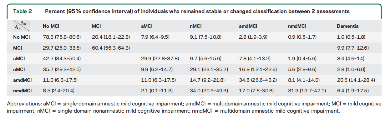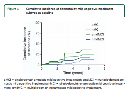 在所有新發(fā)癡呆癥患者中,83.8%的人在診斷前2年符合MCI標(biāo)準(zhǔn)。在癡呆癥診斷前最近的一次評(píng)估中,最常見的MCI亞型是多領(lǐng)域遺忘型(amdMCI),占44.1%。